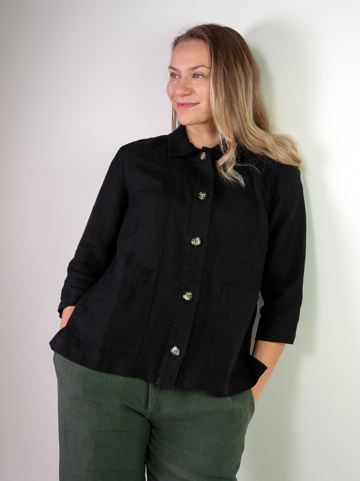 Elsa on lyhyt vuoriton worker-tyylinen paitajakku, jossa edessä on reilunkokoiset paikkataskut. Elsa sopii kevyeksi kesäiseksi heittojakuksi, kun tarvitset jotain peittävämpää päällesi viileän sään varalta. Voit käyttää sitä myös paidan tapaan kiinni napitettuna. Se on kätevä ja siisti jakku matkalle mukaan. Tyylikkään yhtenäisen asukokonaisuuden saat yhdistämällä jakun Asta-pellavahousujen tai Gerda-culottesien kanssa. Malli on suoralinjainen ja mitoitukseltaan väljä. Hartiakaarroke ja väljyyslaskokset antavat liikkumatilaa selkäpuolelle. Hihat ovat suorat ja puolipitkät, edessä nappikiinnitys ja sivuissa helmassa pienet halkiot. Elsa on valmistettu laadukkaasta kauniisti laskeutuvasta ja miellyttävän tuntuisesta Öko-Tex sertifioidusta 100% pellavasta. Kangas on esikutistettu ja lisäksi jakku on tuotepesty, joten se ei kutistu enää kotipesuissa. Jakku on ommeltu lähituotantona Virossa pienessä ompelimossa, pellavan alkuperämaa on Liettua.