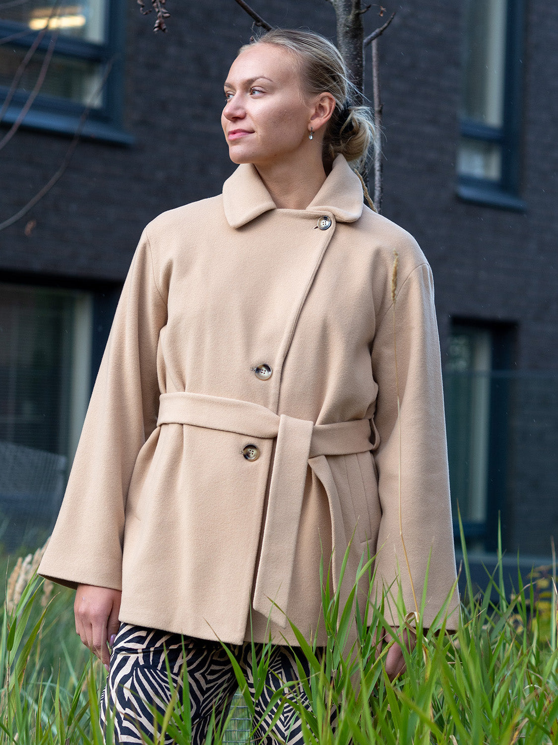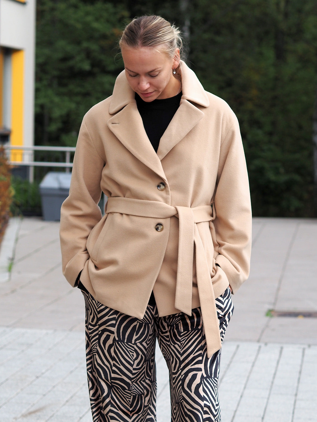 Heini-villakangastakki on valmistettu ylellisen pehmeästä 100% villasta. Heini on tyylikäs ja kevyt villakangastakki syksyyn, leutoon talveen tai alkukevääseen. Se on siisti citytakki vaikkapa autoilijalle tai mainio matkatakki mukaan Keski-Euroopan kaupunkilomille. Materiaali on huippulaadukasta ja miellyttävän tuntuista italiasta villavelouria. Lantion alapuolelle ulottuva takki on kauttaaltaan vuoritettu, vuorin materiaali 100% viskoosi. Takissa on klassinen herrainkaulus, jonka saa suljettua ylös asti kauluskäänteen alla olevalla napilla. Edessä kapeat upotetut listataskut. Takin mitoitus on väljä ja suoralinjainen, hartialinja on hieman pudotettu ja hihat ovat suorat. Takissa on solmittava vyö, mutta voit käyttää takkia myös ilman vyötä tai solmia vyön taakse. Takki on suunniteltu Suomessa ja valmistettu lähituotantona Virossa pienessä ompelimossa. Kuvassa mallilla päällä koko M.