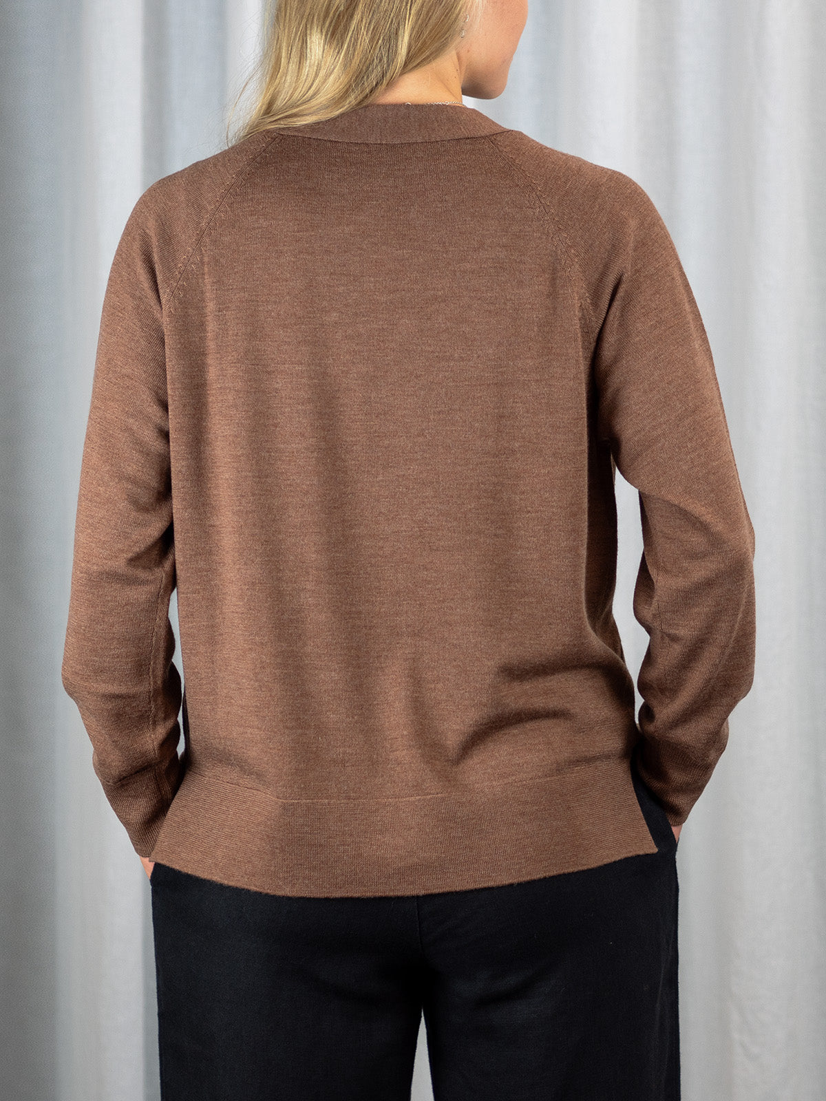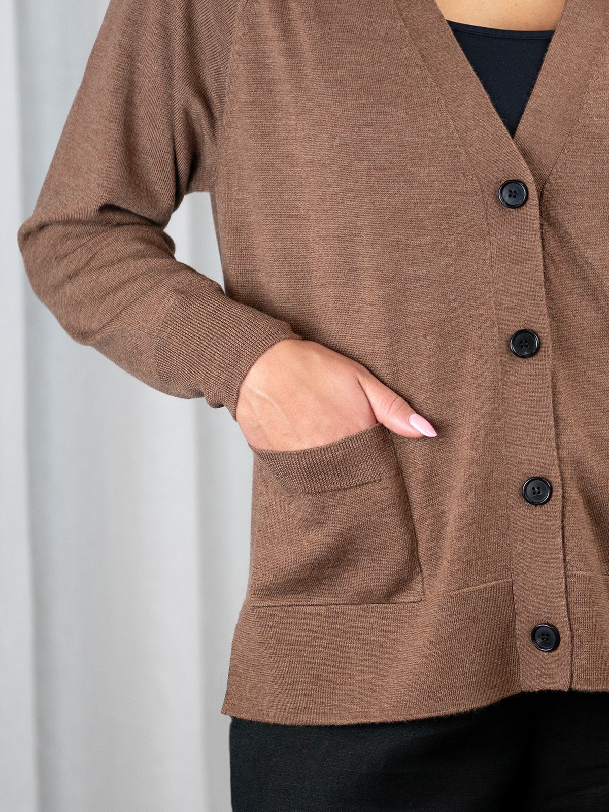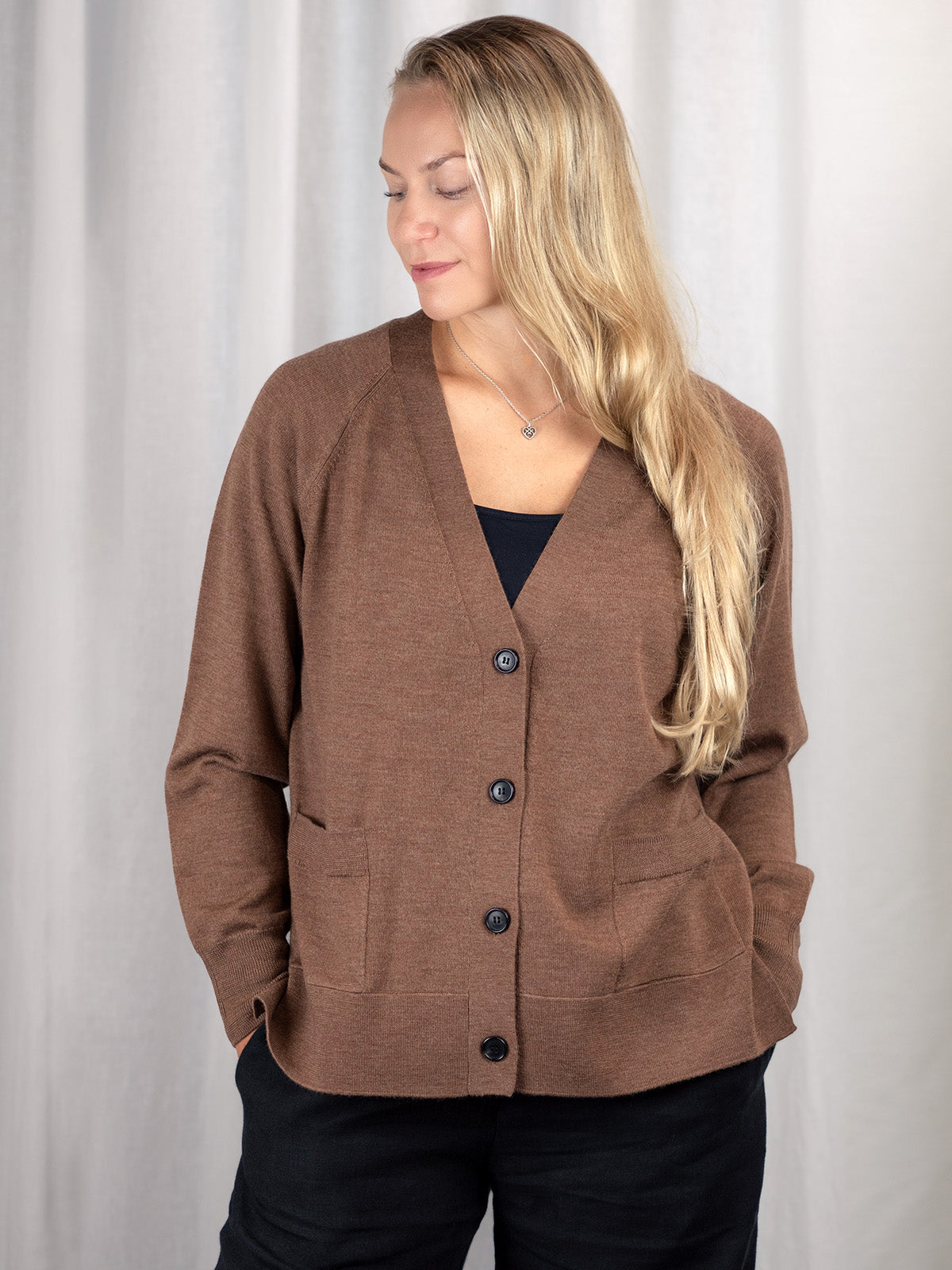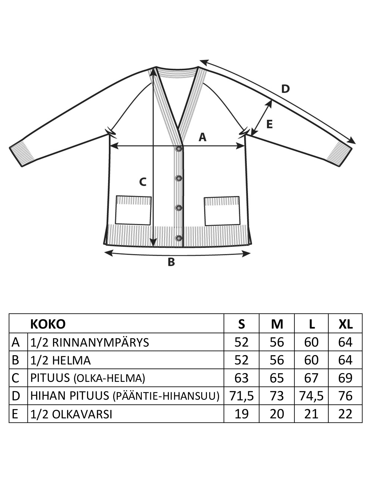 Ylellisen laadukas Hermione-villatakki on valmistettu 100% merinovillasta (mulesing free), jonka erityinen Cash Feel -viimeistys tekee neuleen tunnusta kashmirvillan pehmeän. Hermione on kevyt, lämmin ja helppokäyttöinen lisä täydentämään erilaisia asukokonaisuuksia. Malli on suoralinjainen ja mitoitus on normaalia kokoa. Notkeana ja mukautuvana Hermione mahtuu mainiosti vaikkapa takin alle. Villatakissa on V-pääntie ja etukiinnitys neljällä napilla, edessä myös pienet taskut. Helmassa on sivuhalkiot helman resorineuloksessa. Resorineulos ei ole helmaa kiristävä, vaan jatkaa villatakin suoraa linjaa ja laskeutuu kauniisti lantiolle. Villatakin pituus olalta helmaan koossa M on 65 cm. Kuvassa mallilla päällä koko M.