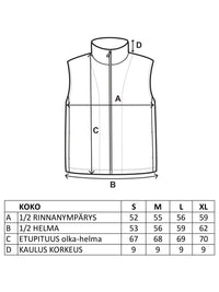 Jade-villafleeceliivi on käytännöllinen ja lämmin lisä moneen asukokonaisuuteen. Pue mieleisesi yläosan päälle tai käytä välikerroksena takin alla. Liivin fleeceneuloksessa on 63% villaa, mikä tekee siitä erityisen lämpimän ja sopivan myös pakkaskelien kerrospukeutumiseen. Jade-liivi on suoralinjainen lantiomittainen malli, jossa on pystykaulus ja edessä kontrastivärinen musta vetoketju. Myös hiha-aukon joustavat kanttaukset ovat mustat. Etusivusaumoihin on upotettu tilava lepotasku. Liivi on vuoriton. Mallin päällä kuvissa koko S, mallin pituus 174 cm.