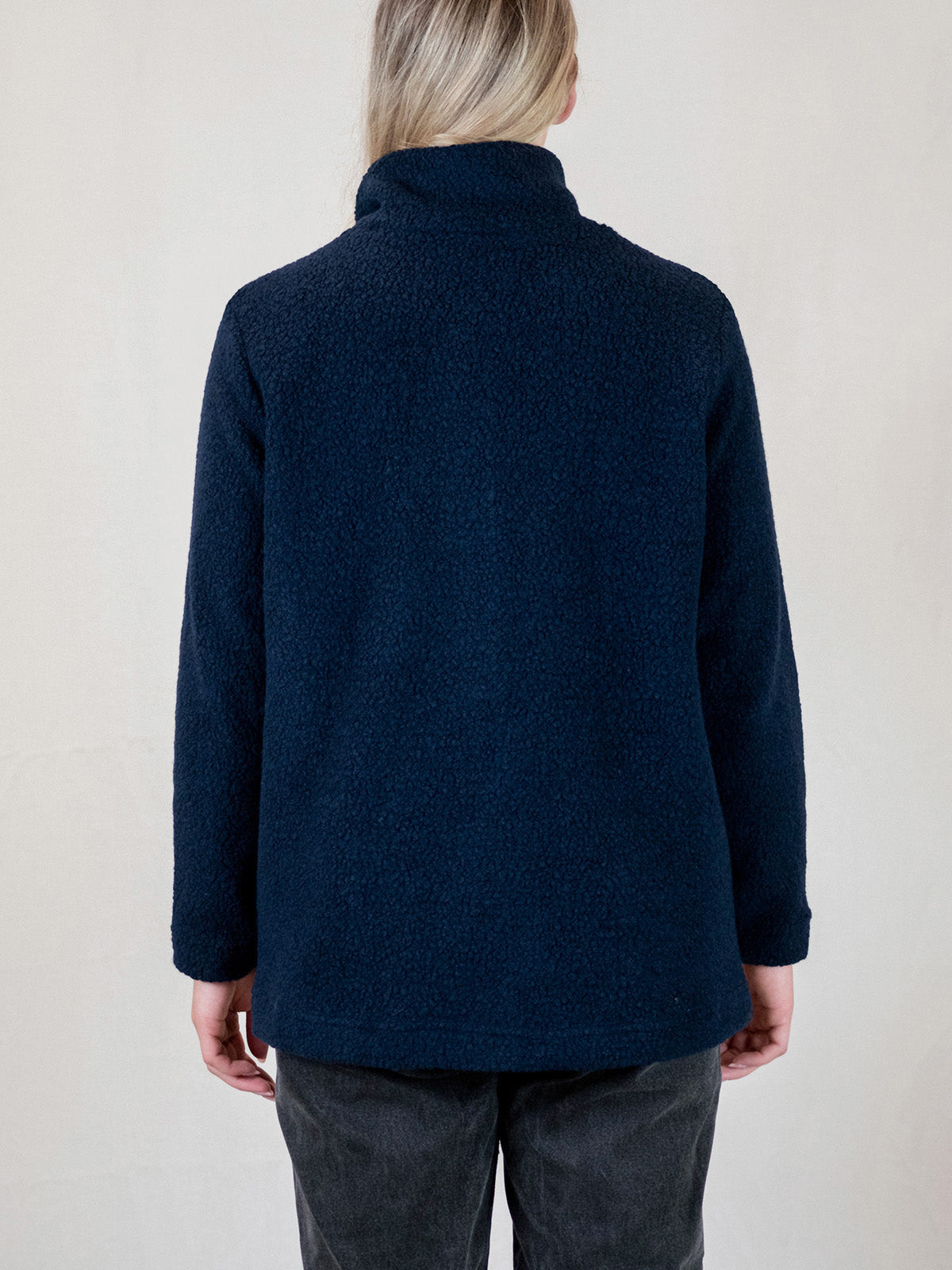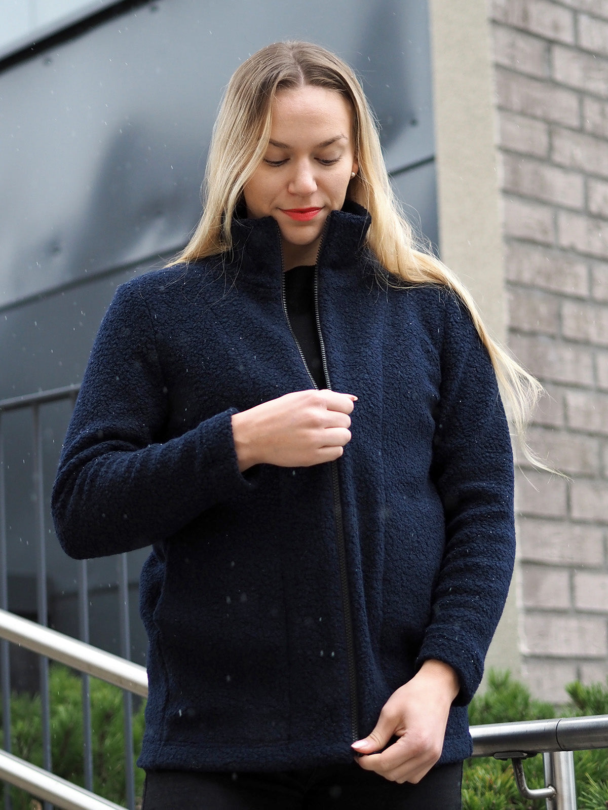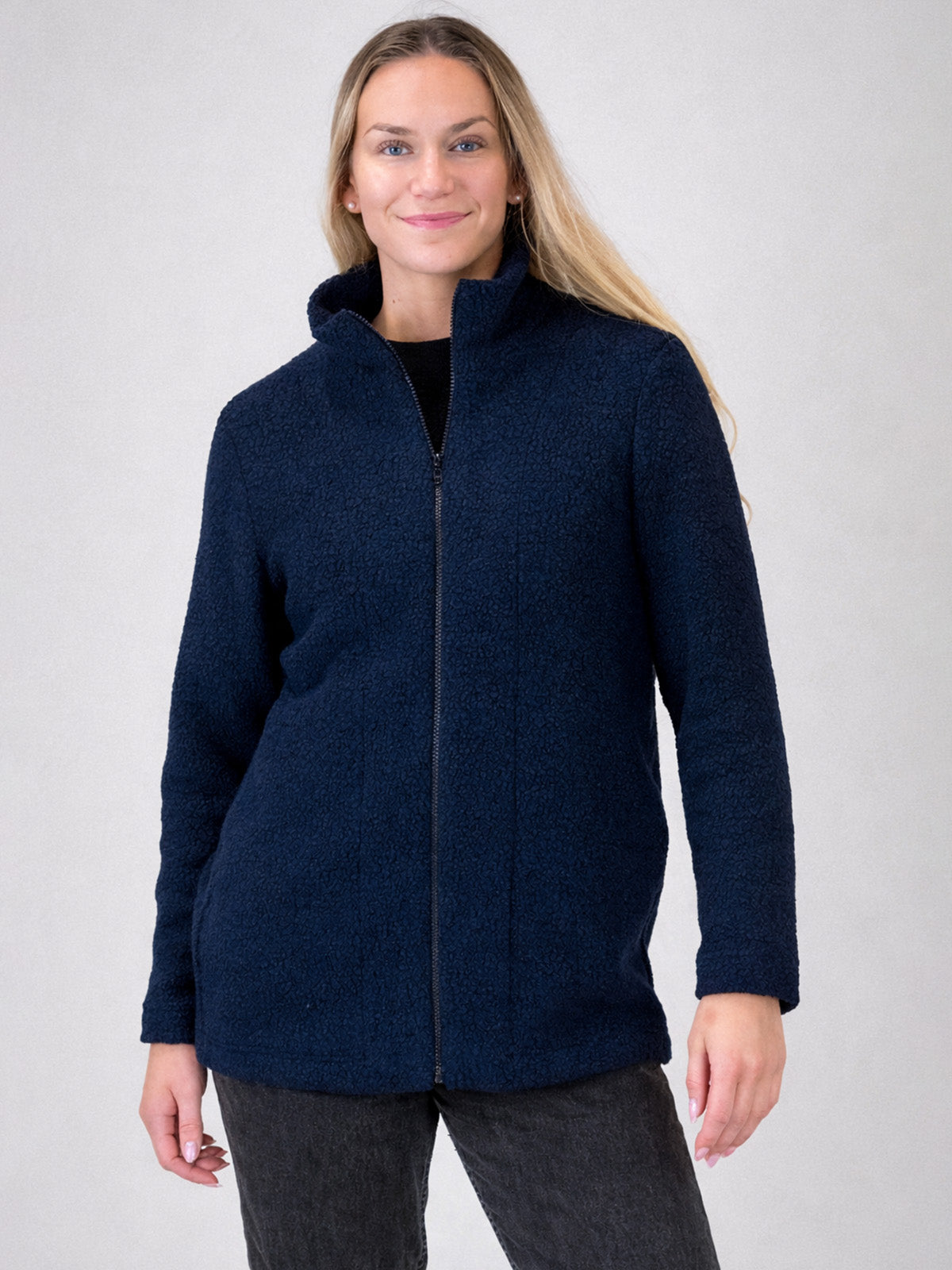 Jemina on kevyt ja lämmin villafleeceneuloksesta valmistettu takki. Se sopii mainiosti leudon talven ja välikauden ulkoiluun ja pihapuuhasteluun tai viileisiin sisätiloihin. Fleece-neuloksessa on 63% villaa, mikä tekee takista erityisen lämpimän ja sopivan myös pakkaskelien kerrospukeutumiseen. Jemina on suoralinjainen lantiomittainen malli, jossa on normaali olkalinja ja hihanistutus. Mallissa on pystykaulus ja edessä vetoketjukiinnitys. Etusivusaumoihin on upotettu tilava lepotasku. Takki on vuoriton. Fleecetakin pituus edessä olalta helmaan koossa M on 74 cm. Mallin päällä kuvissa koko M, mallin pituus 174 cm