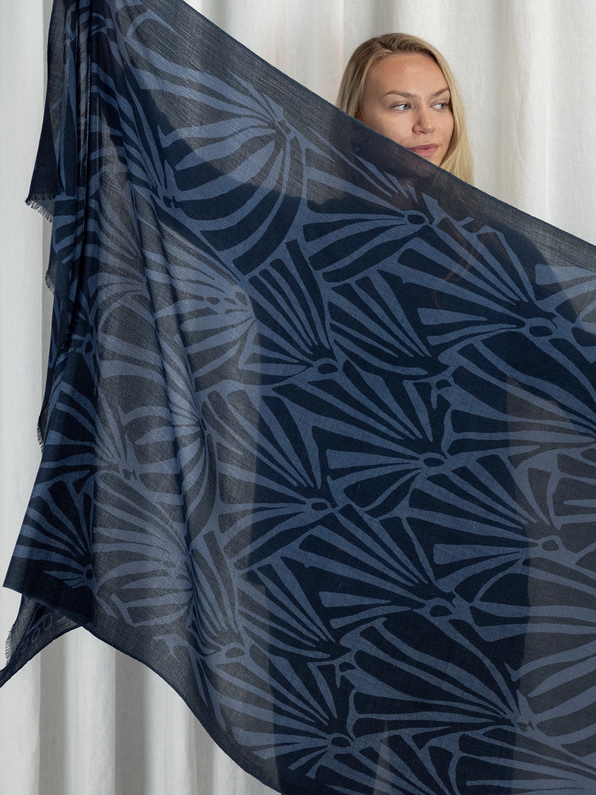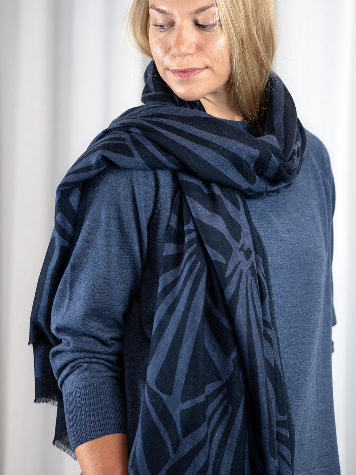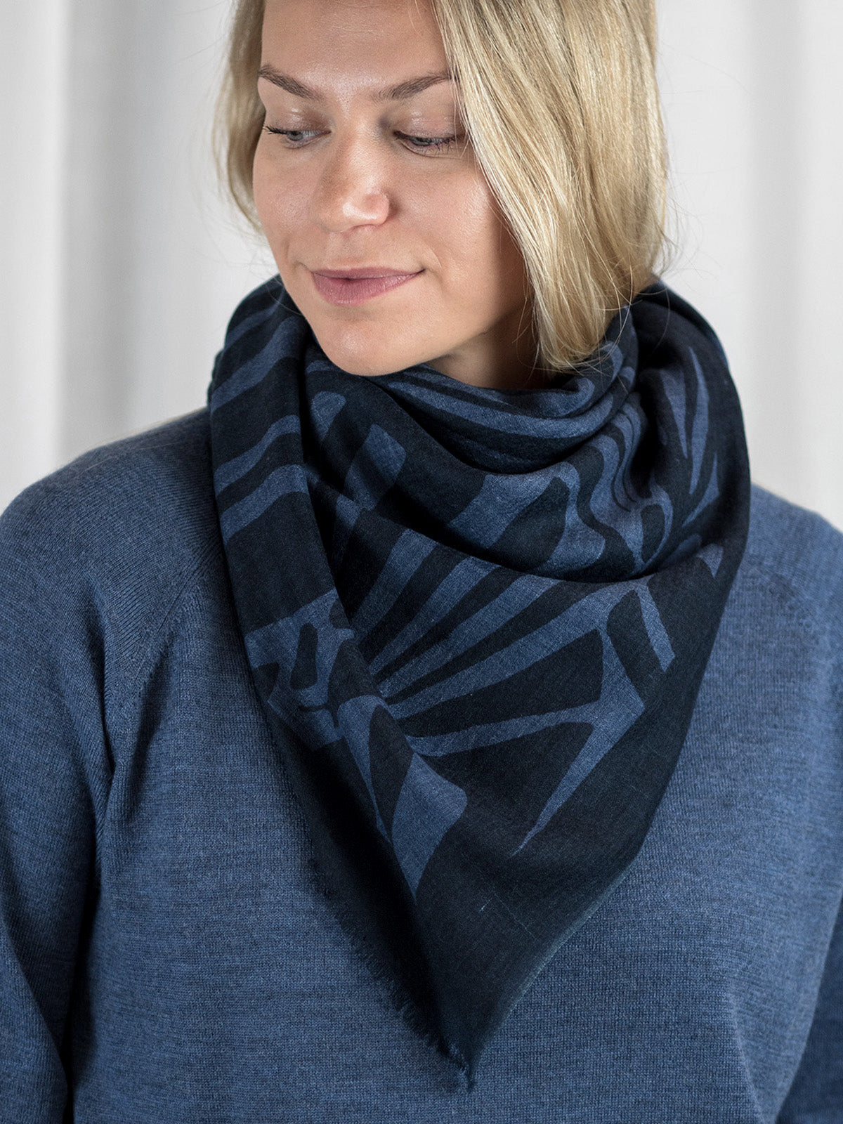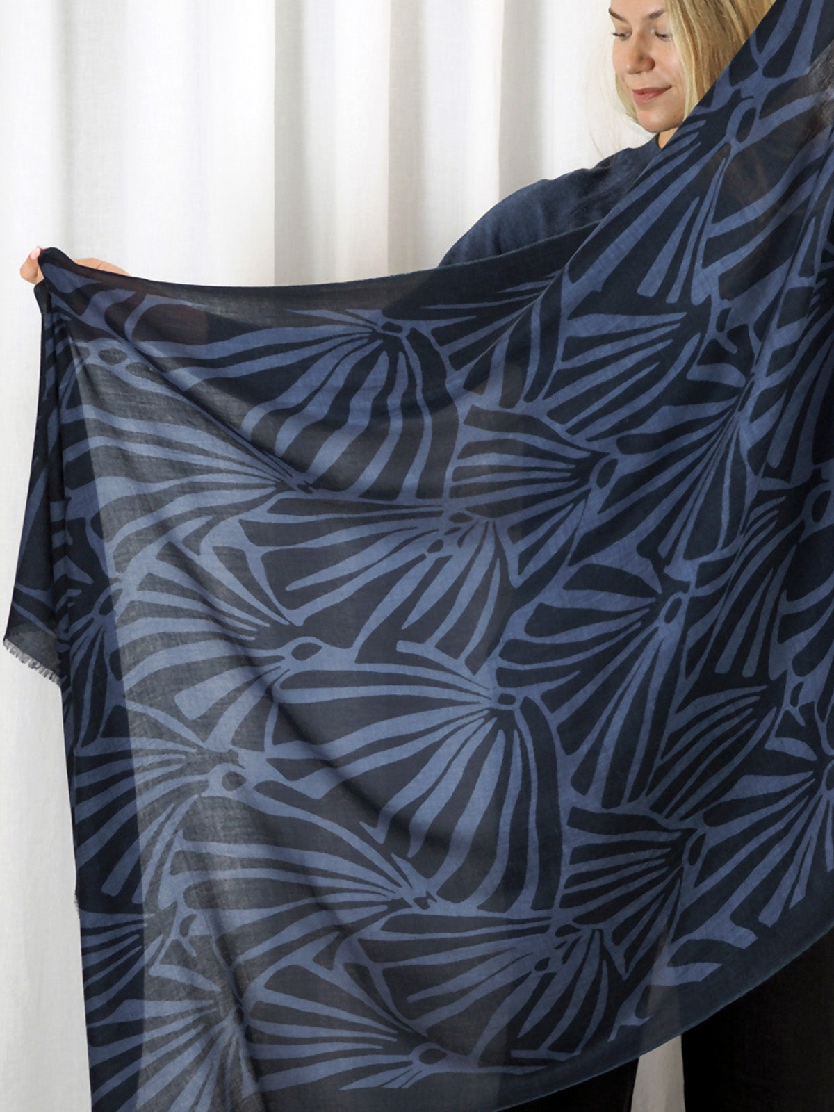 Ylellisen pehmeä ja höyhenen kevyt 100% merinovillasta (mulesing free) valmistettu huivi sopii moneen käyttöön ja asukokonaisuuteen. Voit käyttää sitä hartiahuivina, kietoa kaulaan, sitoa huiviksi päähän tai taitella sen monin kerroin kolmiomaiseksi kaulahuiviksi. Tätä huivia tulet rakastamaan käytössä! Se lämmittää hämmästyttävän paljon keveyteensä nähden. Se onkin todellinen hybridihuivi, jota voi käyttää sekä sisällä että ulkona. Kaulaan kiedottuna huivi lämmittää ulkona talvipakkasilla, sisällä se puolestaan tuntuu miellyttävän kevyeltä ja hengittävältä. Huivi on kätevä mukaan matkoille, teatteriin, ravintolaan tai minne vain, missä on syytä varautua yllättävään viileyteen. Isosta koosta huolimatta taiteltu huivi mahtuu pieneen tilaan, vaikkapa käsilaukkuun. Huivi tuntu ihoa vasten on miellyttävä ja silkkimäisen pehmeä, siksi se sopii myös monille herkkäihoisille. Huivin Haiku-painokuosissa tummansinisellä pohjalla on siniharmaa tyylitelty lehtikuvio. Kuosi on CUOSIn omaa designia.